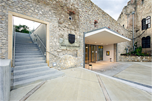 Ein zweiter Personenlift erschließt vom Erdgeschoß aus die oberen Geschoße der Burg, den Festsaal und die dem Festsaal zugeordneten eigenen Sanitäranlagen. Die im Erdgeschoß eingerichtete Küche ist über diesen Aufzug an den Festsaal angebunden. Das Erdgeschoß umfasst den Garderobebereich, ein Bar- und Pausenzone im Vestibül und zwei WC-Gruppen samt Behinderten-WC.